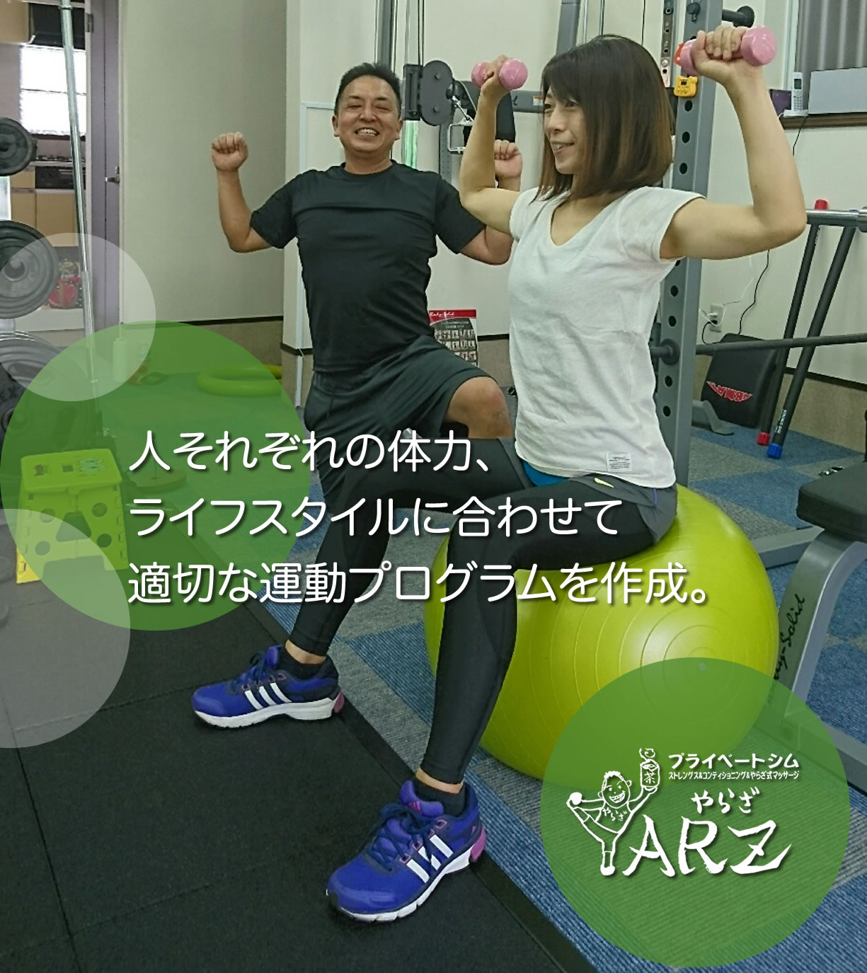 やらざでは、人それぞれの体力・モチべーシションに合わせ最適な運動プログラミングを作成しサポートしていきます。